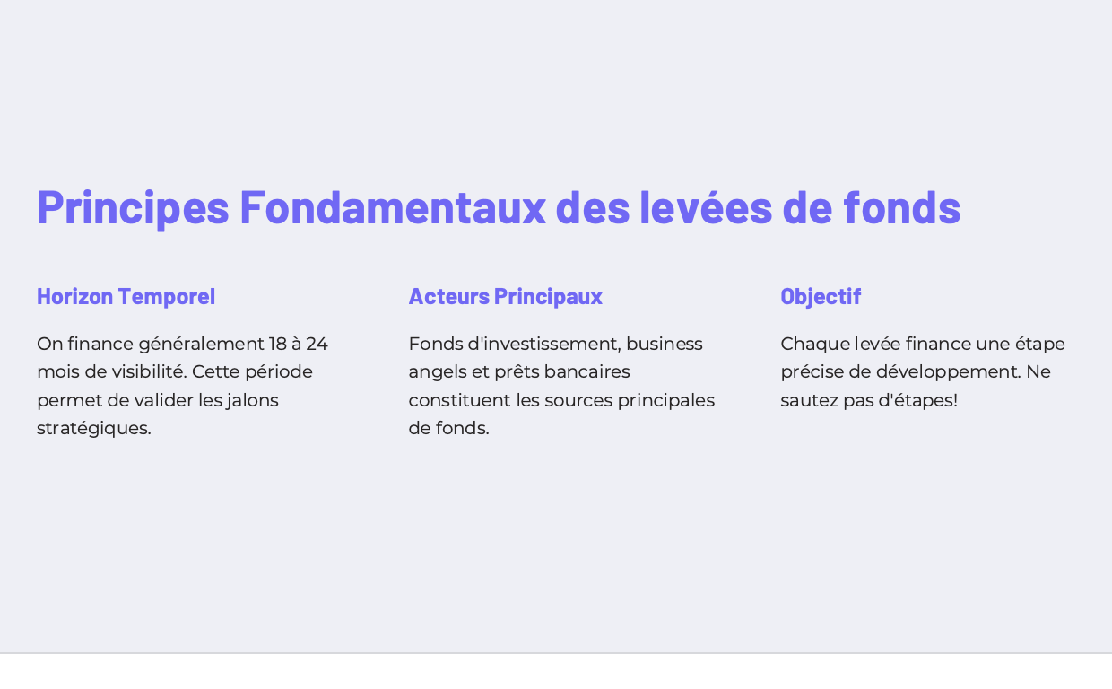 On finance gĂ©nĂ©ralement 18 Ă 24 mois de visibilitĂ© pour son entreprise qui permettent de valider les principaux jalons les uns aprĂšs les autres. Les acteurs qui entrent en jeu sont des investisseurs privĂ©s type fonds dâinvestissements en capital-risque et business angels, complĂ©tĂ©s par des prĂȘts bancaires et dâautres aides publiques.